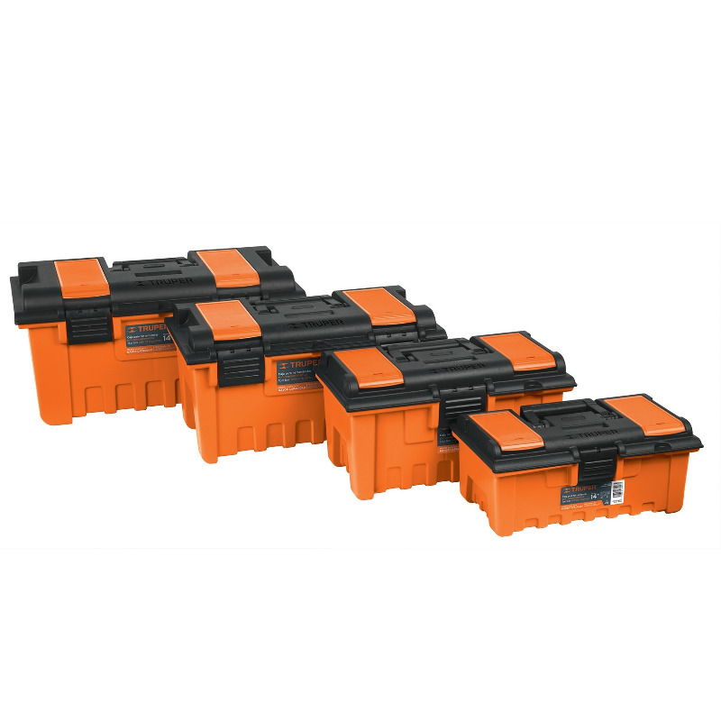 Кейс для инструмента, торговая марка Truper, артикул CHA-22NC, изготовлен из ударопрочного полипропилена с усиленными углами, включает съемный внутренний лоток для мелких деталей. Имеет металлический замок с ушком для навесного замка.