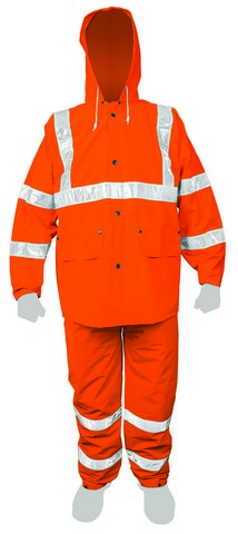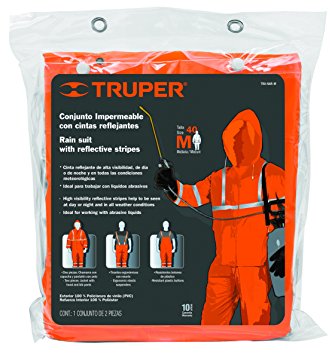 Комбинезон дождевик, оранжевый, светоотражающий, размер M, артикул TRA-NAR-M, марка «Truper». Изготовлены из 100% ПВХ (поливинилхлорида) с внутренней армировкой 100% полиэстером. Стойкий к щелочам, минеральным маслам, многим кислотам и растворителям. Имеют светоотражающие ленты для хорошей видимости в ночное и дневное время. Используются для работ требующих внимания и работ с абразивными житкостями. Кимбинезон состоит из брюк с нагрудниками и куртки с капюшоном.
