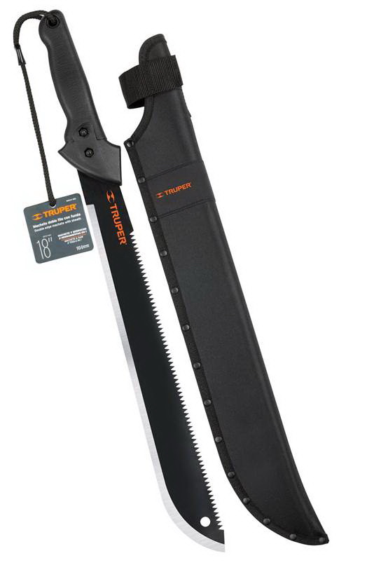 Мачете в чехле, торговая марка «Truper», артикул MACH-18X, модель «Doble Filo», является полезным приспособлением, на даче, рыбалке в туристическом походе и т.д. Может использоваться для рубки веток, кустарников, кукурузы, камыша. Лезвие изготовлено из высокоуглеродистого стального полотна с противокоррозионным покрытием, имеет эргономичную обрезиненую рукоятку из ударопрочного полистирола черного цвета. Поставляется в специальном защитном чехле для удобного ношения на ремне.