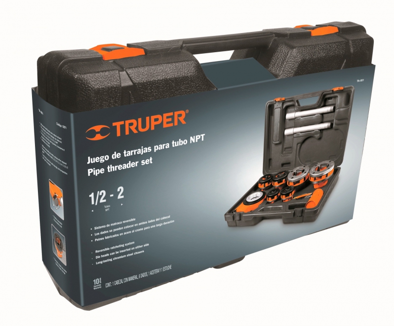 Набор резьбонарезных клуппов, артикул TA-851, торговая марка «Truper». Состоит из 10-ти предметов: Разборной рукоятки состоящей из двух частей, реверсным держателем, масленки и 6-ти матриц, которые применяются для нарезания резьбы 1/2″, 3/4″, 1″, 5/4″, 6/4″, 2″.