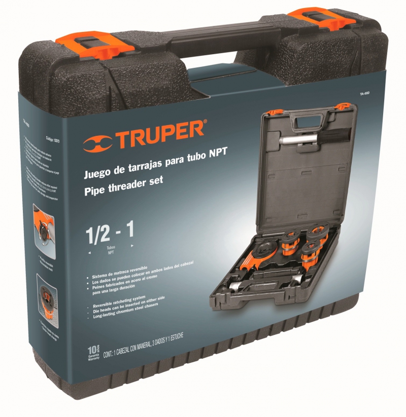 Набор клуппов Truper, артикул TA-850. Состоит из матриц для нарезания резьбы диаметрами 1/2, 3/4, 1 1/2. Изготовлены из хром-ванадиевой стали. Используется для нанесения наружной резьбы на металлические трубы.