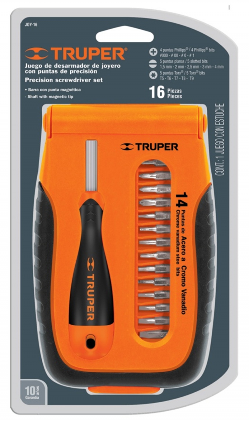 Отвертка прецизионная с набором бит артикул JOY-17, торговая марка Truper. Имеет эргономичную рукоятку. Применяется для выполнения мелких ремонтных работ в быту и профессиональной деятельности. Отвертка поставляется в комплекте с битами, имеющими распространенные типы и размеры рабочих профилей.