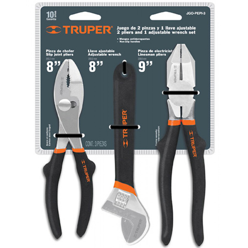 Набор плоскогубцев (пассатижей) профи «Truper», артикул JGO-PEPI-3. Изготовлены из кованной хром-ванадиевой стали и удобными не скользящими виниловыми ручками. Применяется для различных монтажных и строительных работ. Состоит из трех предметов: