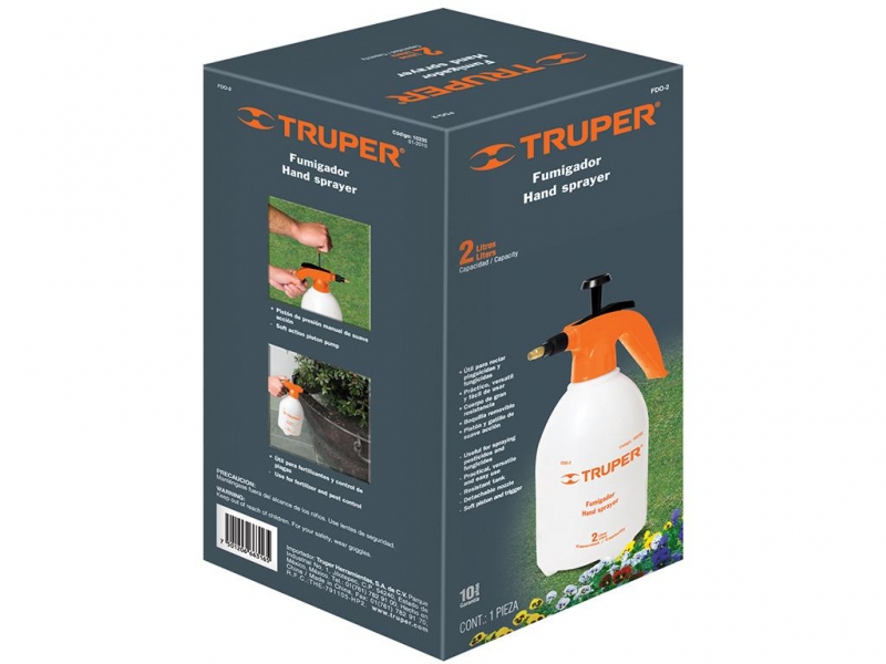 Опрыскиватель ручной, Truper, артикул FDO-2. Отлично подходит для ухода за небольшим садом или цветником. Предназначен для увлажнения листьев цветов, распыления пестицидов, фунгицидов и удобрений, для борьбы с вредителями. Также применяется в ситуациях не связанных с растениеводством и садоводством, например дезинфекция, мытье окон, глажка белья и др. Регулируемое латунное сопло (форсунка или конус). Имеет два вида опрыскивания.