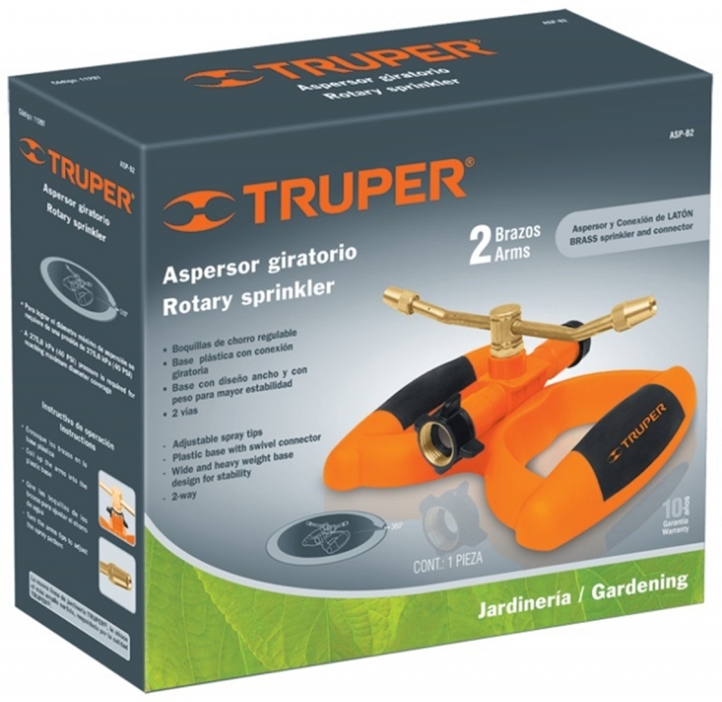 Ороситель ротационный пульсирующий с двумя вращающимися поливочными регулируемыми форсунками из латуни. Применяется для полива газона и растений на садовом участке. Обеспечивает равномерное распределение воды, даже при низком давлении. Имеет устойчивую конструкцию с пластиковым основанием в виде бабочки, корпус стабильный к ультрафиолету.