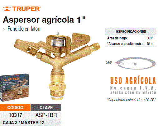 Ороситель импульсный (пульсирующий), применяется для полива газона, сада. Корпус оросителя сделан из высококачественной латуни. При максимальном напоре (давлении) воды, максимальный диаметр орошения составит 15 м. Рекомендуемое рабочее давление от 2,5 до 3,5 атмосфер (40-50 PSI).