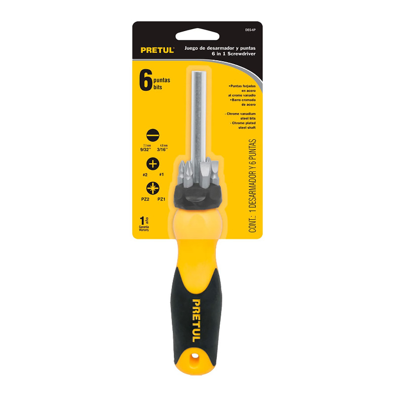 Отвертка держатель бит, 6 бит в комплекте, производитель Truper, торговая марка Pretul, артикул DES-6P. Имеет кованые наконечники из хромованадиевой стали. Пруток из хромистой стали. Нескользящая ручка из полипропилена и TPR. Удобный дозатор наконечников.