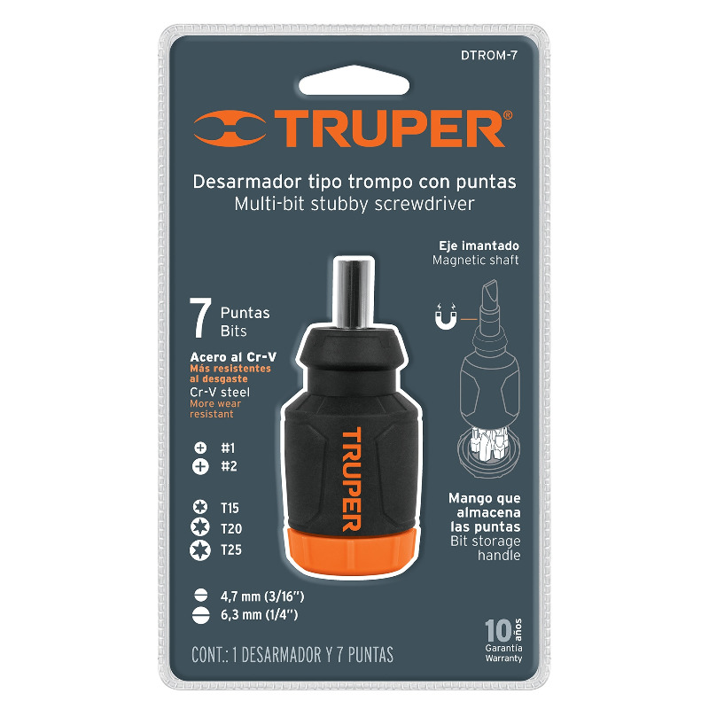 Отвертка Truper, арт. DTROM-7 имеет в своем арсенале сем насадок (бит) с распространенными рабочими профилями. Биты изготовлены из хром-ванадиевой стали. Ручка отвертки имеет эргономичную форму. Данная отвертка отлично подходит для использования в быту.