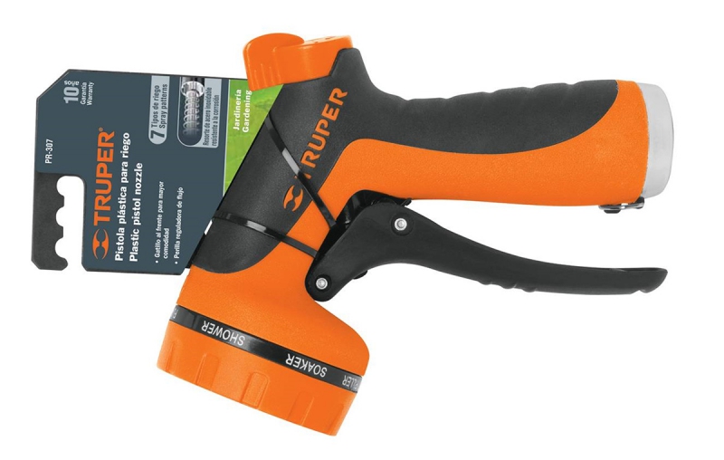 Пистолет поливочный садовый, предназначен для полива растений, мойки поверхностей и т.д. Изготовлен из прочного АВС пластика с эргономичной прорезиненной изоляционной рукояткой. Имеет 7-мь режимов работы для полива , а так же специальный фиксатор рукоятки для непрерывной работы, пружина рукоятки изготовлена из антикоррозионного материала. На пистолете имеется краник для регулировки напора воды. За счет небольшого веса, удобен в использовании.