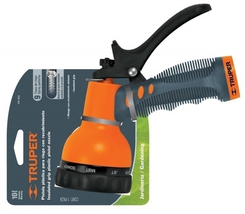 Пистолет садовый предназначен для полива растений и мойки поверхностей, изготовлен из прочного АВС пластика с эргономичной прорезиненной изоляционной рукояткой. Имеет 9-ть режимов ирригационных функций для полива, а так же специальный фиксатор рукоятки для непрерывной работы, пружина рукоятки изготовлена из антикоррозионного материала. За счет небольшого веса, удобен в использовании.