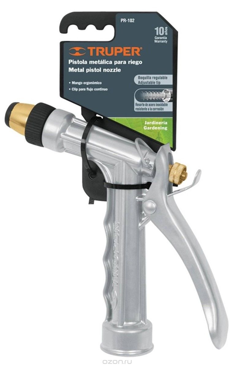 Пистолет поливочный садовый, предназначен для полива растений, мойки поверхностей и т.д. Изготовлен из прочного цинкового сплава с эргономичной рукояткой. Пистолет имеет специальную регулируемую насадку для полива в двух режимах, а так же специальный фиксатор рукоятки для непрерывной работы, пружина рукоятки изготовлена из антикоррозионного материала. За счет небольшого веса удобен в использовании.
