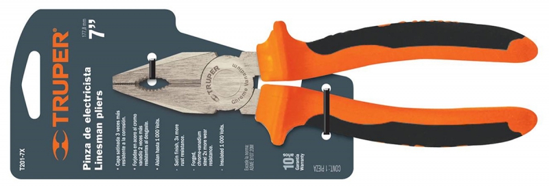Плоскогубцы профессиональные «Truper» артикул T201-7X, изготовлены из кованой стали хром-ванадий, которая в два раза прочнее углеродистой стали. Комфортные эргономичные рукоятки из APR имеют диэлектрические ручки, которые выдерживают напряжение до 1000 Вольт. Рабочая часть имеет сатинированную поверхность металлической части, что обеспечивает надежную защита от коррозии. Губки имеют специальные насечки противоскольжения. Предназначены для захвата деталей, манипулирования и перекусывания проволоки.