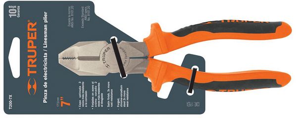 Плоскогубцы профессиональные усиленные «Truper» артикул T200-9X, изготовлены из кованой стали хром-ванадий, которая в два раза прочнее углеродистой стали. Комфортные эргономичные рукоятки из APR имеют диэлектрические ручки, которые выдерживают напряжение до 1000 Вольт. Рабочая часть имеет сатинированную поверхность металлической части, что обеспечивает надежную защита от коррозии. Губки имеют специальные насечки противоскольжения. Предназначены для захвата деталей, манипулирования и перекусывания проволоки.