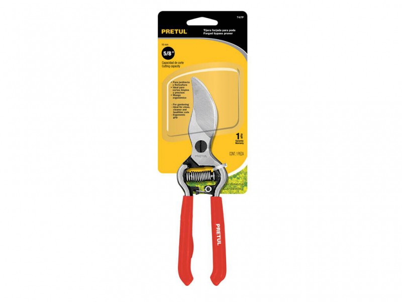 Секатор садовый кованый с закаленным лезвием повышенной прочности, артикул T-67P, торговая марка "Pretul" входящая в концерн "Truper". Применяется для обрезки не толстых веток деревьев, кустарников и цветов, обеспечивает чистый срез для быстрого заживления. Имеет удобные эргономичные рукоятки в форме запястья с ПВХ покрытием, минимизируя нагрузку на кисть руки и обеспечивая длительную и удобную работу.