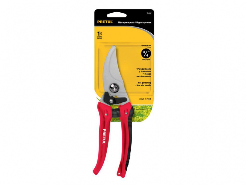 Секатор прямой тонкий, артикул T-35P, торговая марка «Pretul», входящая в концерн «Truper». Применяется для работы с виноградной лозой и зелеными ветками. Ручки секатора изготовлены из прочного полиэтилена с нескользящей поверхностью. Снабжен системой автоматического открытия.