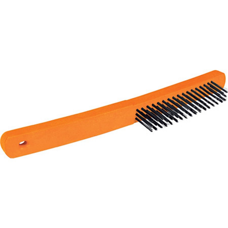 Щетка металлическая с прямой длинной полипропиленовой ручкой для работы в труднодоступных местах. Щетина изготовлена из стальной проволоки с высоким содержанием углерода. Применяется для очистки и удаления ржавчины и краски с поверхностей, а так же зачистки сварочных швов.