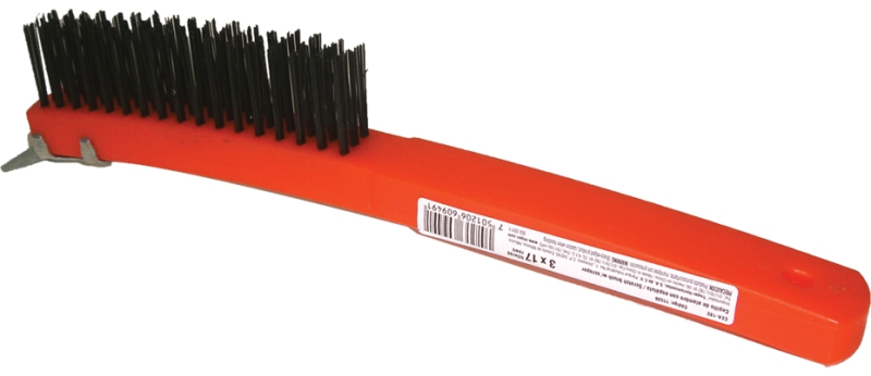 Щетка металлическая с прямой длинной полипропиленовой ручкой для работы в труднодоступных местах. Имеет специальный скребок для удаления краски. Щетина изготовлена из стальной проволоки с высоким содержанием углерода. Применяется для очистки и удаления ржавчины и краски с поверхностей, а так же зачистки сварочных швов.