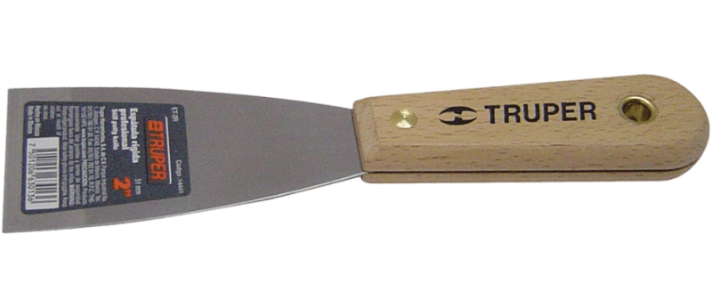 Шпатель торговой марки «Truper», артикул ET-2R. Изготовлен из качественной закаленной стали марки SAE1070, имеет деревянную ручку из дерева гикори (американский орех). Применяется для нанесения и разравнивания шпатлевки, снятия старой краски и обоев.