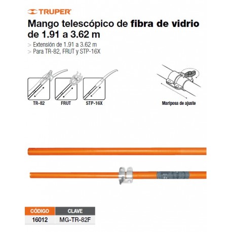 Штанга телескопическая, артикул MG-TR-82F. Применяется для высотного сучкореза, артикул TR-82, а так же может использоваться для собирателя фруктов, артикул FRUT и садовой пилы артикул STP-16X. Очень легкая и прочная телескопическая штанга имеет специальный фиксатор позволяющий фиксировать необходимую длину штанги от 1,9 метров до 3,6 метров.