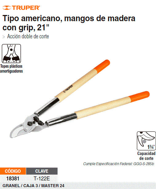 Сучкорез Truper TB-122, изготовлен из качественной стали марки SAE 1045, имеет длинные деревянные ручки из дерева ясеня с обрезиненными держателями для рук, которые выполняют функцию рычага, поэтому нужно прикладывать меньше усилий на обрезку веток. Для удобства работы установлен резиновый демпфер (амортизатор). Лезвия крепятся между собой по принципу болтореза это облегчает перекусывание особо твердых веток.