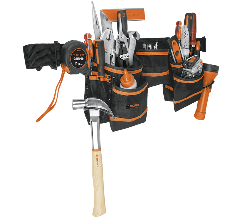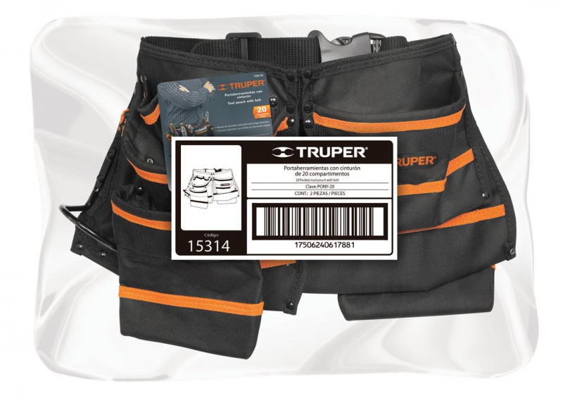 Сумка для инструментов на 20 карманов, арт.PONY-20, торговая марка «Truper». Предназначена для хранения и переноски инструмента. Поясная сумка для инструмента имеет регулируемый ремень от 80 до 138 см. Изготовлен из полиэстера с подкладкой из ПВХ. Сумка имеет два держателя из коррозионностойкой стали для молотков.