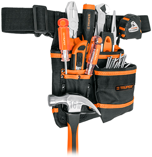 Сумка для инструментов на 7 карманов, арт.PONY-7, торговая марка «Truper». Предназначена для хранения и переноски инструмента. Поясная сумка для инструмента имеет регулируемый ремень от 80 до 138 см. Изготовлен из полиэстера с подкладкой из ПВХ. Сумка имеет один держатель из коррозионностойкой стали для молотка. Ремень снабжен быстросьемной пряжкой.