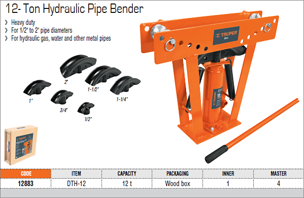 Трубогиб гидравлический, торговой марки «Truper», артикул DTH-12. Применяется для гибки труб. В комплект поставки входят специальные формы в количестве 6-ть штук для гибки труб следующих размеров: 1/2 "(12,7 мм) 3/4" (19 мм), 1 "(25,4 мм), 11/4 "(31.7mm), 1 1/2" (38,1 мм) и 2 "(50,8).