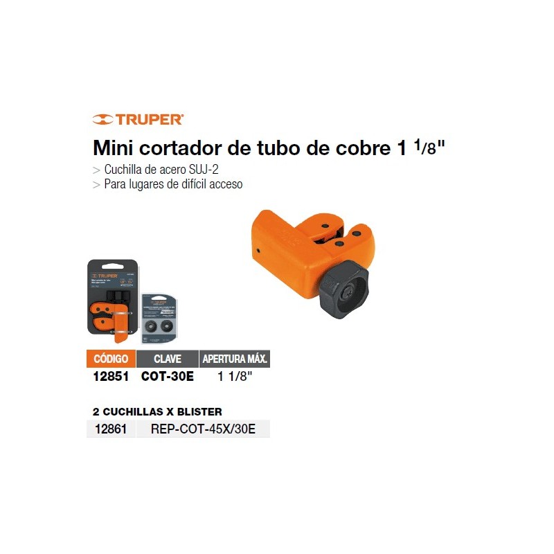 Труборез для медных труб, артикул COT-30E. Подходит для работы в ограниченном пространстве, имеет удобную тонкую настройку. Имеет возможность смены лезвия для увеличения ресурса работы. Применяется для работы с медными и аллюминиевыми трубами.