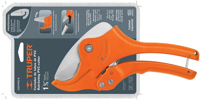 Труборез профессиональный, артикул COT-PVC-X. Применяется для резки труб из ПВХ - поливинилхлорида. Имеет прочный и легкий алюминиевый корпус с удобными рукоятками и нож из нержавеющей стали. Специальный усиливающий механизм поможет при резке труб прикладывать меньше усилий.