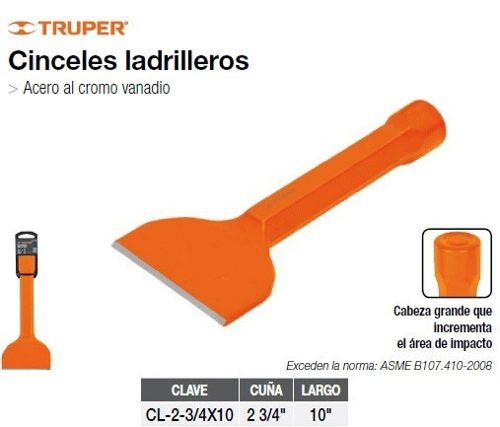 Зубило каменщика, торговой марки Truper, артикул CL-3-1/2X10, применяется для обработки камня, кирпича, тротуарной плитки и т.д. Рабочая часть инструмента изготовлена из хромованадиевой стали, рукоятка имеет расширенный затыльник для более точного попадания при ударе.