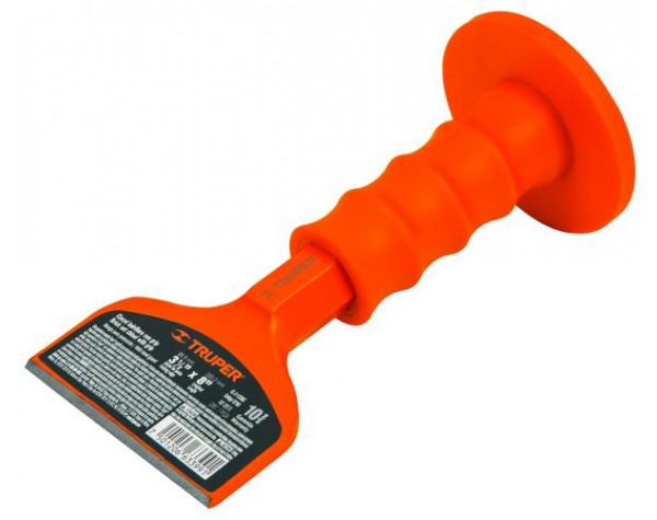 Зубило каменщика безопасное, торговой марки Truper, артикул CL-3-1/2X8G, применяется для обработки камня, кирпича, тротуарной плитки и т.д. Рабочая часть инструмента изготовлено из хромованадиевой стали, а удобная пластиковая рукоятка для надежного обхвата имеет специальный грибок (ограничитель) для предотвращения случайного удара по кисти рук.